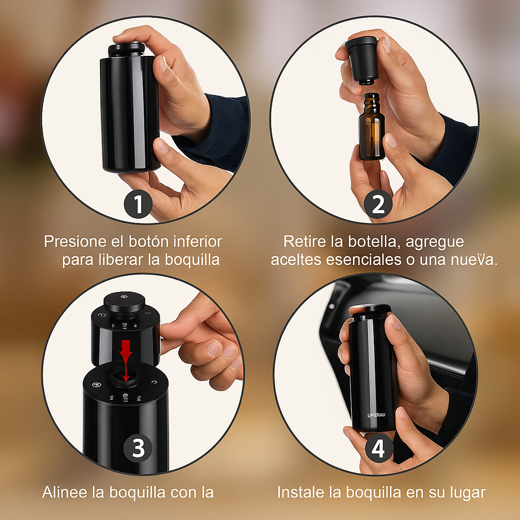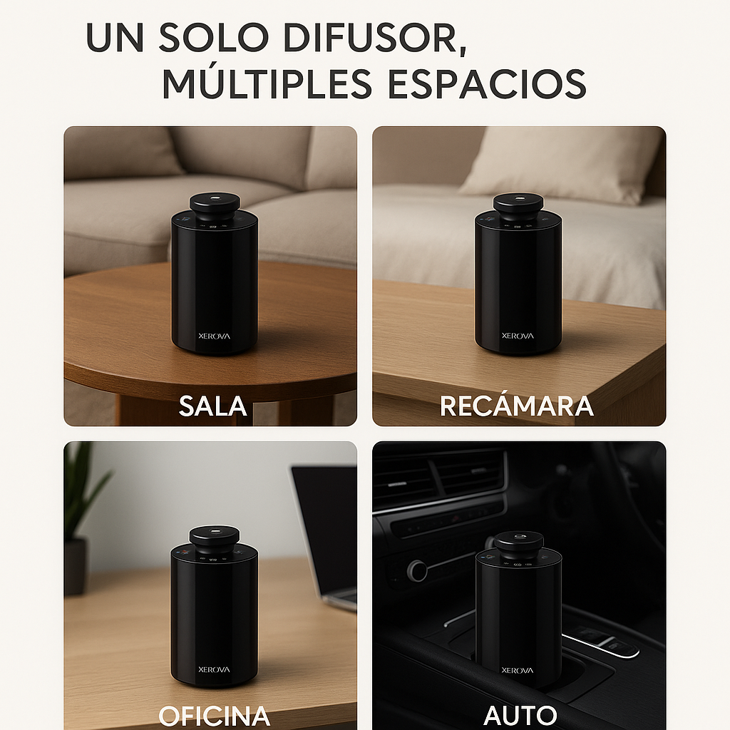 Transforma cualquier espacio de 3 m² con nuestro Difusor de Aromaterapia Ultrasónico XEROVA. Sin necesidad de agua, este elegante dispositivo negro difunde tus aceites esenciales favoritos con solo presionar un botón. Disfruta de aromas constantes y silenciosos en tu sala, recámara, oficina o auto. Su diseño portátil y sistema a prueba de derrames te garantiza una experiencia aromática premium sin complicaciones. Lleva bienestar y elegancia contigo a donde vayas.